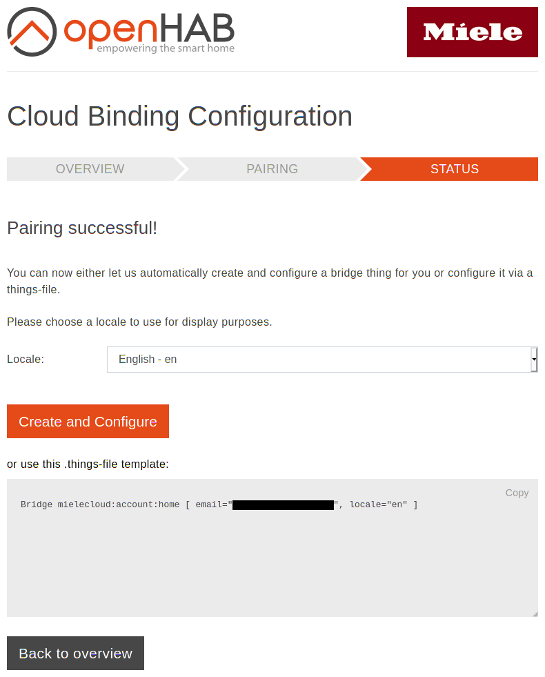 When everything worked, you are presented with a page stating that pairing was successful. Select the locale which should be used to display localized texts in openHAB channels. From here, you have two options: Either let the binding automatically configure a bridge instance or copy the presented things-file template to a things-file and return to the overview page.