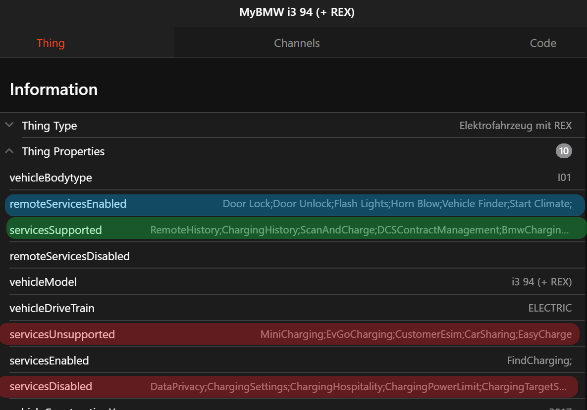 The binding provides access like MyBMW App to openHAB. All vehicles connected to an account will be detected by the discovery with the correct type: