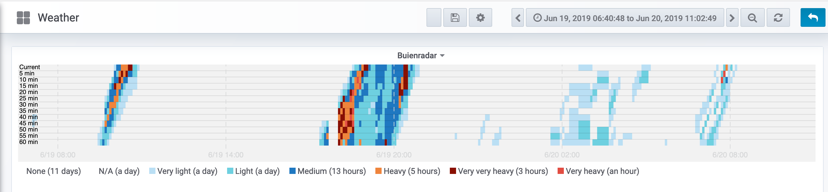 and adding the relevant items as such in your .items file. Please note that the buienradar service only provides predictions in 5 minutes intervals with a maximum of two hours (120 minutes):