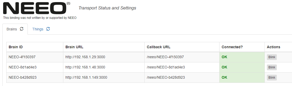 The Brains tab provides a listing of all NEEO brains that have been found, some information about them and their current status (connected or not).