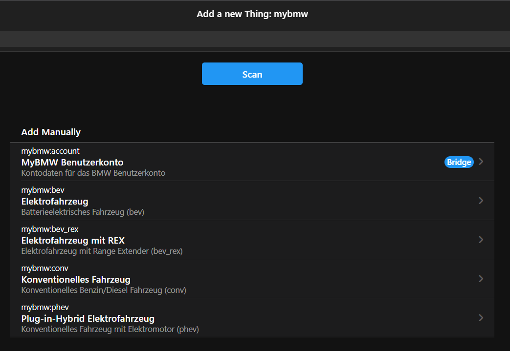 The binding provides access like MyBMW App to openHAB. All vehicles connected to an account will be detected by the discovery with the correct type: